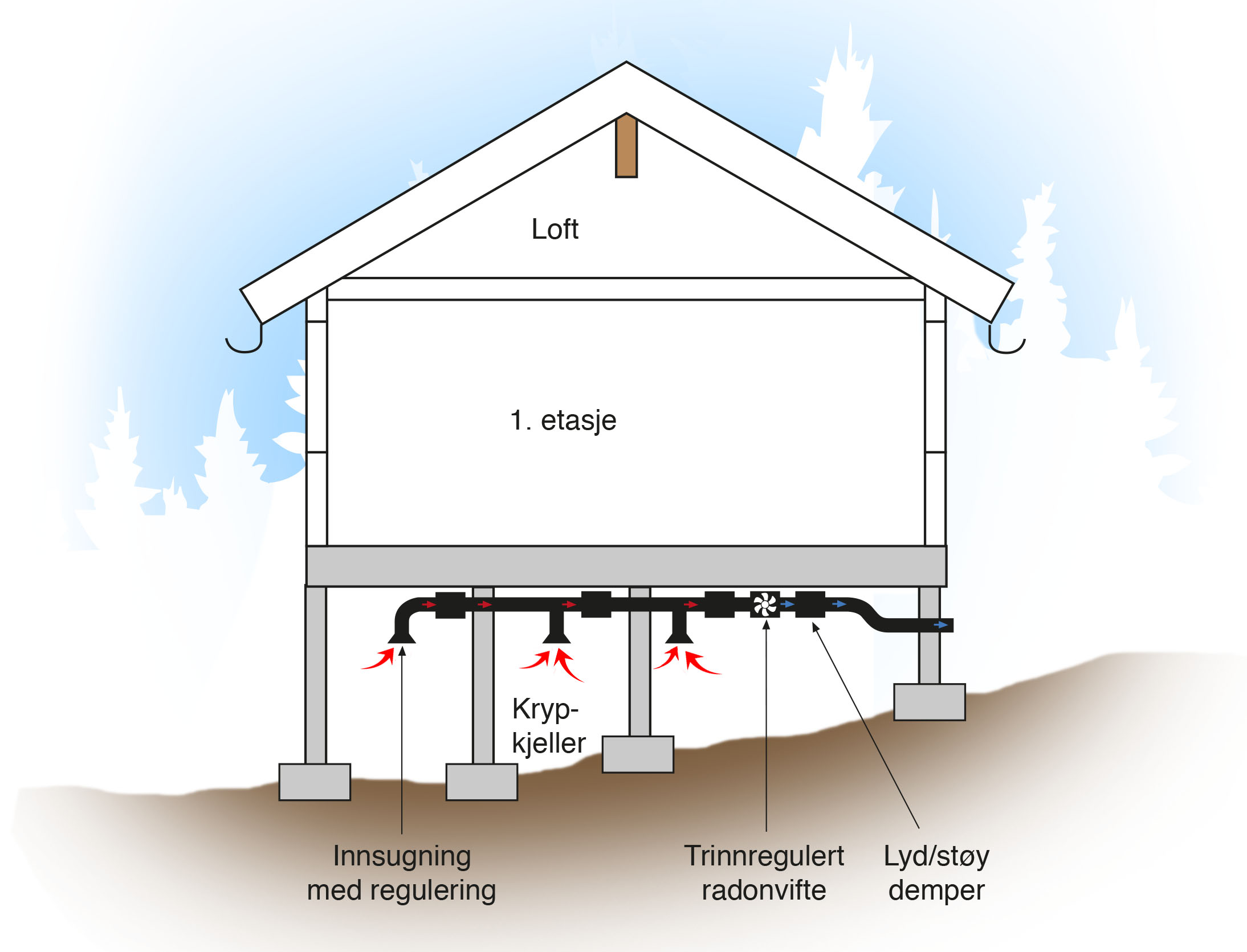 Ved hjelp av våre kraftige trinnregulerte radonvifter vil vi kunne redusere radonkonsentrasjonen i krypkjelleren slik at du får et radonsikkert hjem.